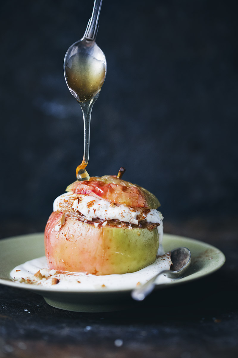 The idea to pimp regular oatmeal/porridge by stuffing it inside baked apples is pretty great in its simplicity. But here we make it a tad more special and extra delicious by cooking the oatmeal with pure apple juice/cider, spices, butter or coconut oil and chopped almonds for extra rich flavor and texture. We then top the baked apples with a thick yogurt and drizzle with ginger honey for sweetness. And if you’ve got a little nut butter at home, that’s also good on top. Always use local apples if they are available and in season, they taste way better!