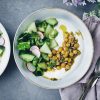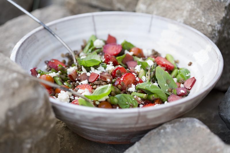 A simple vegan option would be to replace the halloumi with marinated tofu. Just make sure to squeeze out the liquid before marinating it, so it soaks up all the flavor. Quinoa, black lentils or rice could also be a great addition if you want to make this salad more substantial.