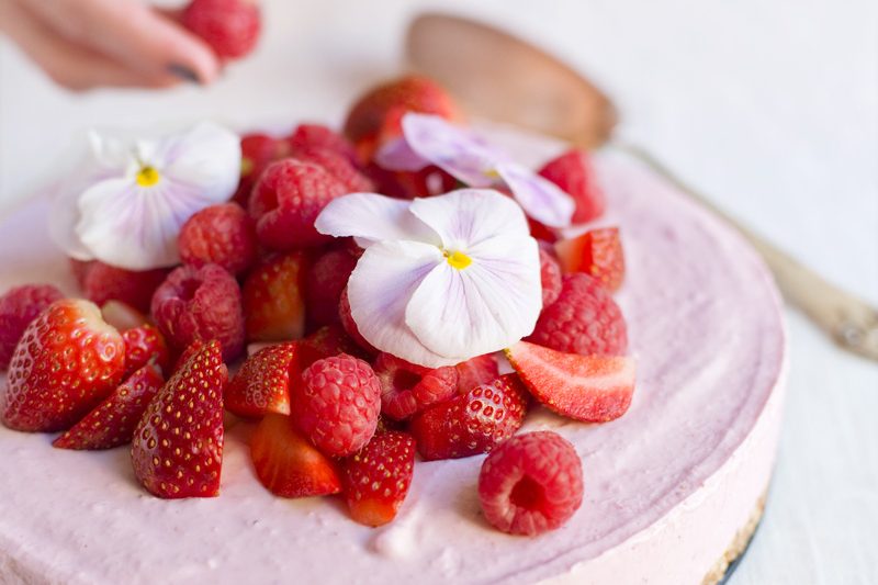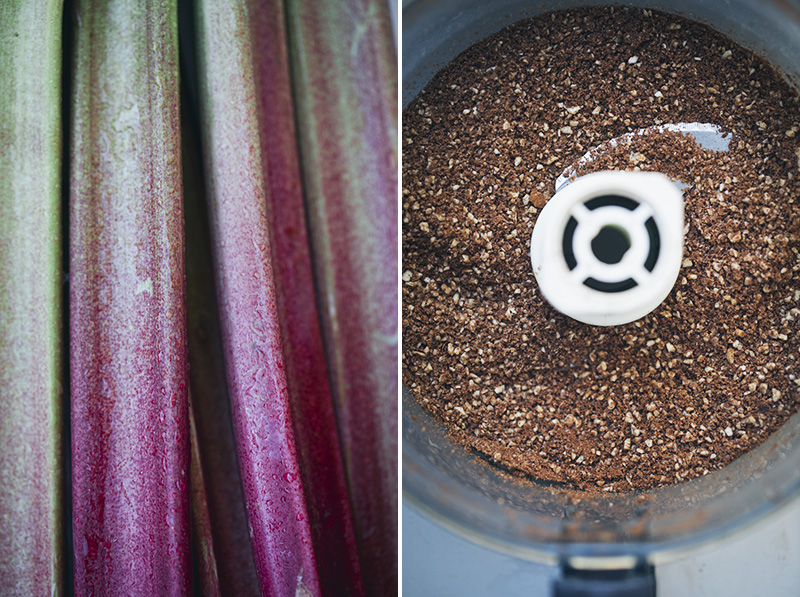 Start by making the jam. Slice rhubarb and strawberries thinly and add them to a sauce pan together with the rest of the jam ingredients. Cook on low heat for approx. 20 minutes until soft. Use a hand blender to mix it if you prefer it smooth, or leave it chunky. Let cool entirely. Meanwhile, prepare the raw hazelnut wafer.