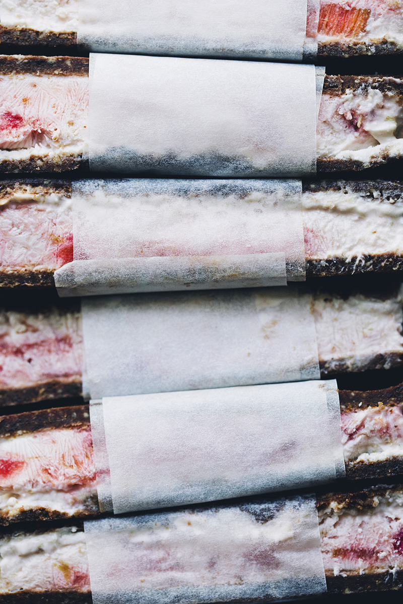 We have tried two different versions of the ice cream and are sharing both here. One is made with mascarpone and quark cheese (so it’s technically a frozen cheesecake) and is super simple and delicious. The other version is vegan and made with coconut milk and soaked cashew nuts. You can use an ice cream maker to get it even creamier but we simply skipped that extra step this time. Unless you’re an ice cream purist, you’ll see that the no-churning method works well for a sandwich bar, just let them soften a few minutes before digging in. They are super tasty and a real treat to have ready in the freezer. We’ve cut them pretty big here but you could cut them in squares instead and end up with twice as many.