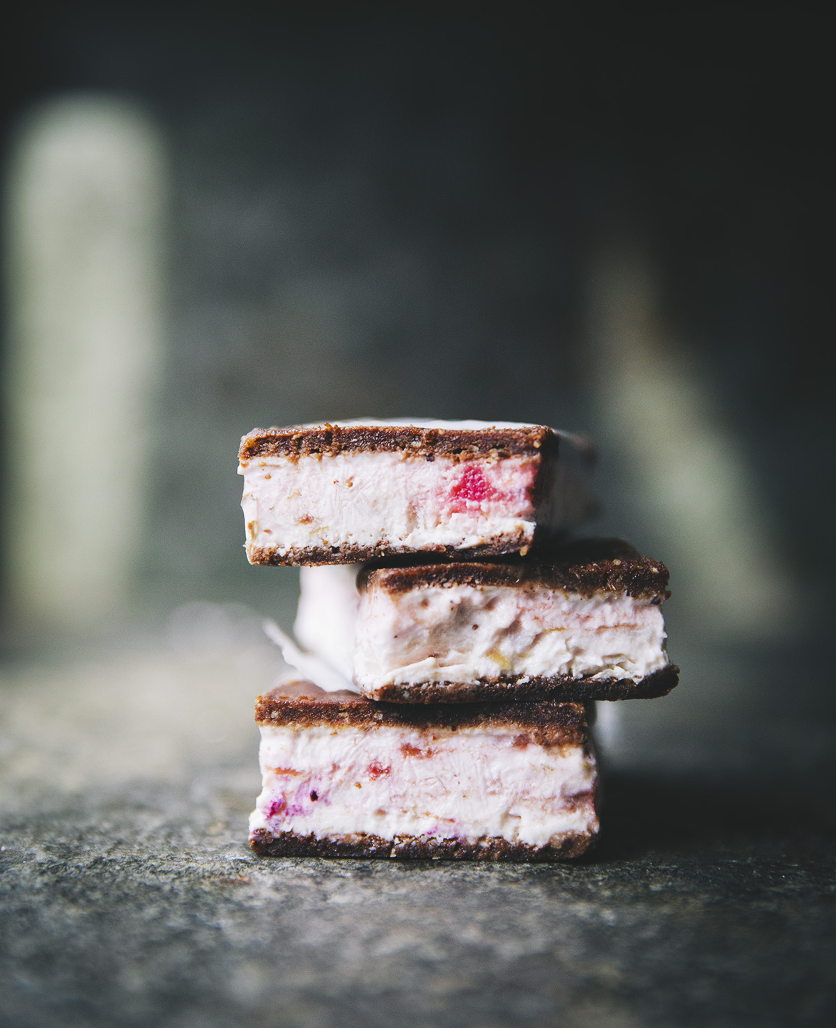 Making homemade ice cream sandwiches is a fun little weekend project. It doesn’t take too much active time but they do need a couple of hours to firm up in the freezer. Unlike normal sandwich bars, ours are made with raw wafers and a rhubarb swirled no-churn ice cream. The raw wafer is simple to make and the rich chocolate hazelnut flavor balances the tanginess from the rhubarb nicely. We are showing how to get the wafer thin and perfectly sized in the video further down.