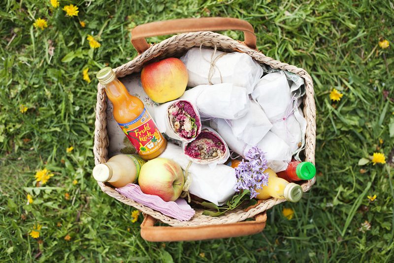 When we make wraps, they tend to come out differently every time, but this vegan version is a real treat so I think it will be on repeat for our next couple of picnics. These are filled with large lettuce leaves, lots of herby mint & parsley hummus (also delicious on it’s own!), a lentil, avocado and cucumber salad and topped with fresh strawberries for sweetness and toasted sunflower seeds for crunch. Picnic is ready!