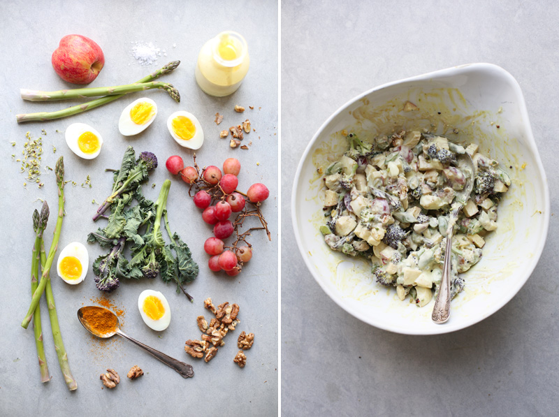 We wanted to infuse spring, so we have added asparagus, fresh broccolini, walnuts, sprouts and some fruit for sweetness. And we replaced most of the mayo with a thick yogurt. The result is so good. Full of flavor and crunch. Serve it on a piece of cabbage lettuce, with a salad, as a side dish or as the Danes; on a piece of dark rye bread. Velbekomme!