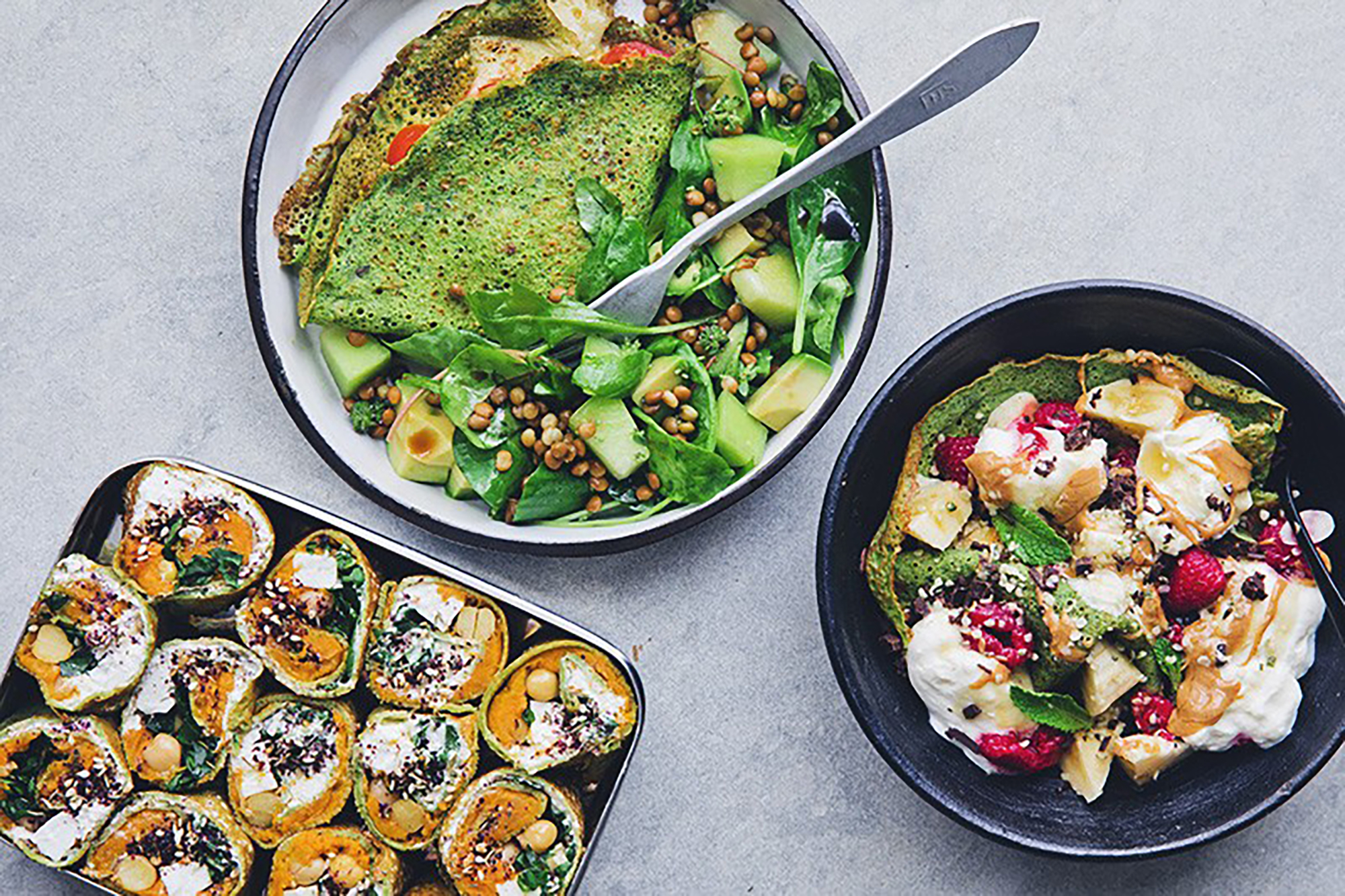 You can use almost any veggies in pancake rolls. Just make sure you have something creamy and sticky as base to bind them together. For a vegan version, use hummus instead of yogurt and tofu instead of feta cheese and sprinkle with nutritional yeast.Next time, we’ll add some crushed walnuts for crunch, pomegranate seeds for extra tanginess and maybe a couple of mint leaves for a fresh flavor twist.