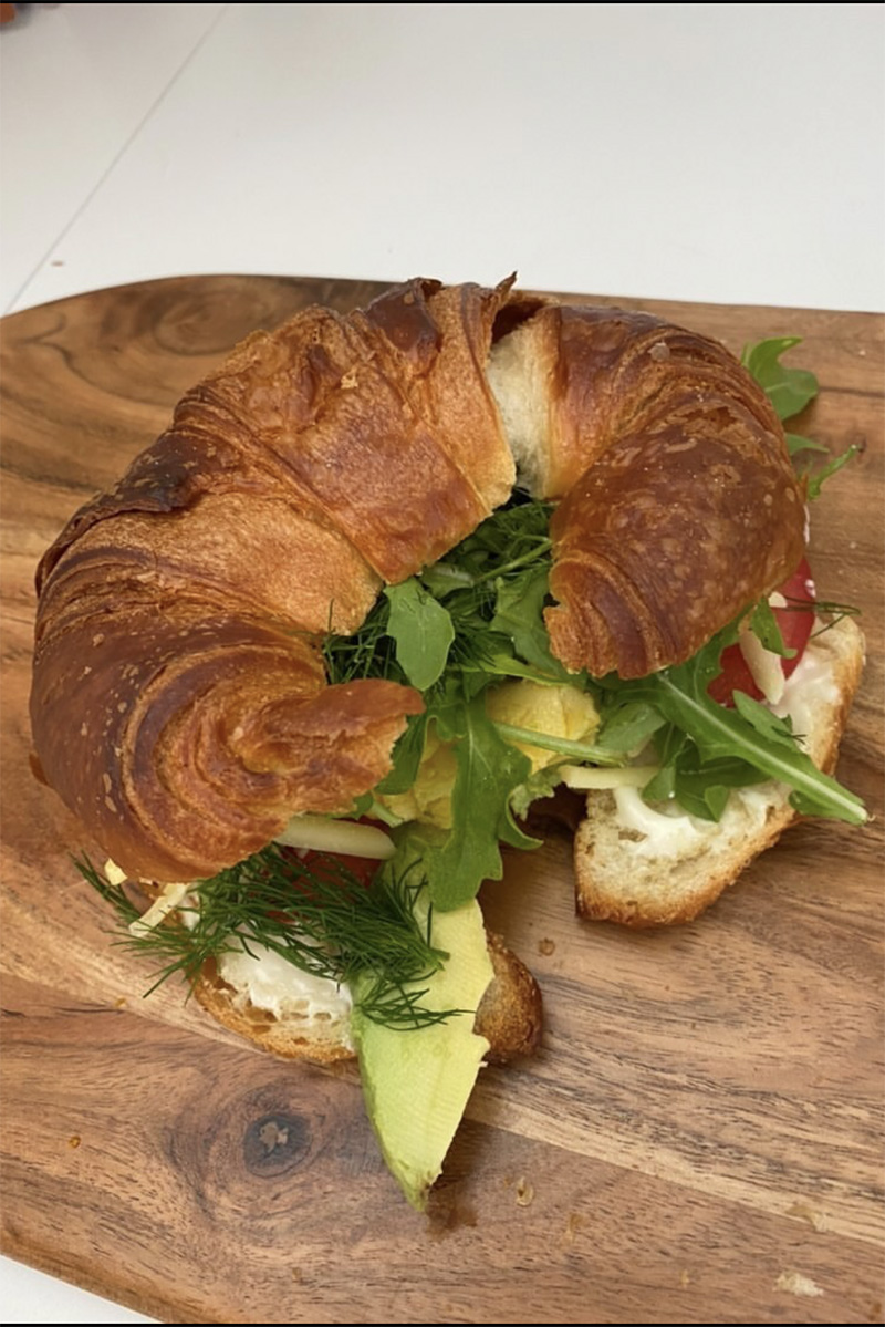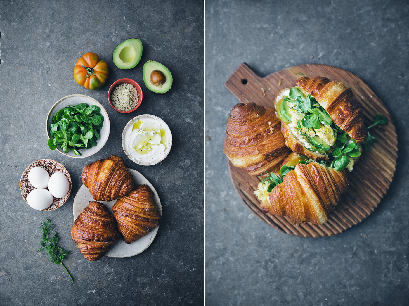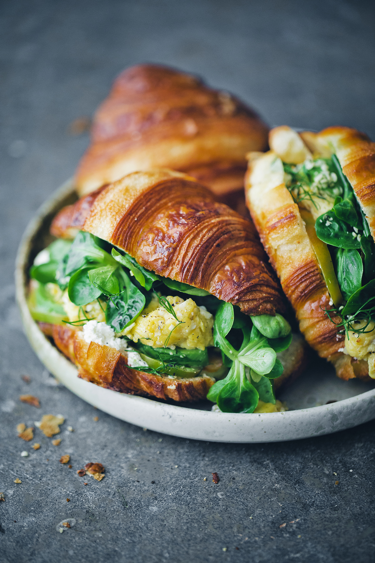As much as I love porridge bowls, banana pancakes, baked carrot cake oatmeal and rye bread sandwiches, croissants play in a breakfast league of their own – they are so buttery, flaky, crunchy and the fact that it takes hours and hours to make them also makes it feel more special eating them. We have a few good bakeries near where we live so we haven't baked our own croissants for years (we do a have a pretty epic rye croissant in our Green Kitchen Travels book). When we bring the kids they always beg for chocolate filled croissants but on the occasions when we have natural croissants at home, adding a savory filling to them is the best breakfast/brunch hack. They look super luxurious and taste so rich and satisfying. We fill them with creamy eggs, tangy labneh and lots of greens, inspired by egg-croissants we have had at cafes in Australia, Capetown and L.A. But just filling them with a slice of cheese and greens is also good. It's also the perfect thing to make if you have one or two day-old croissants at home.