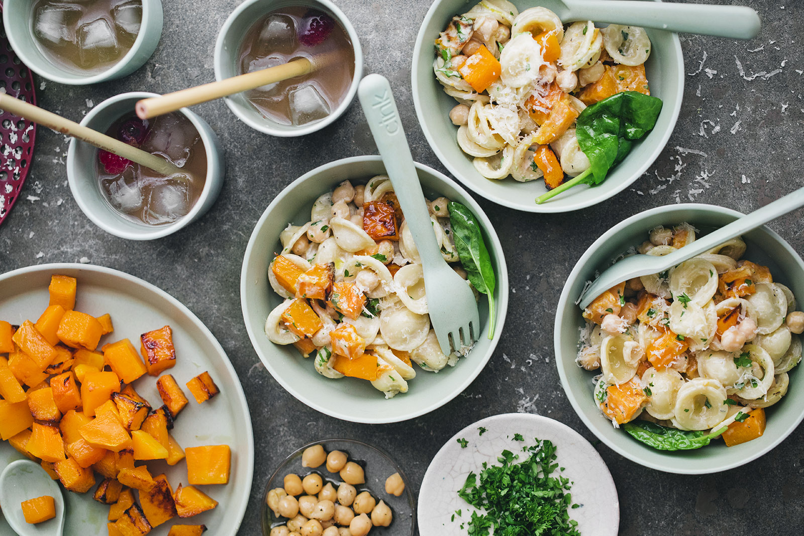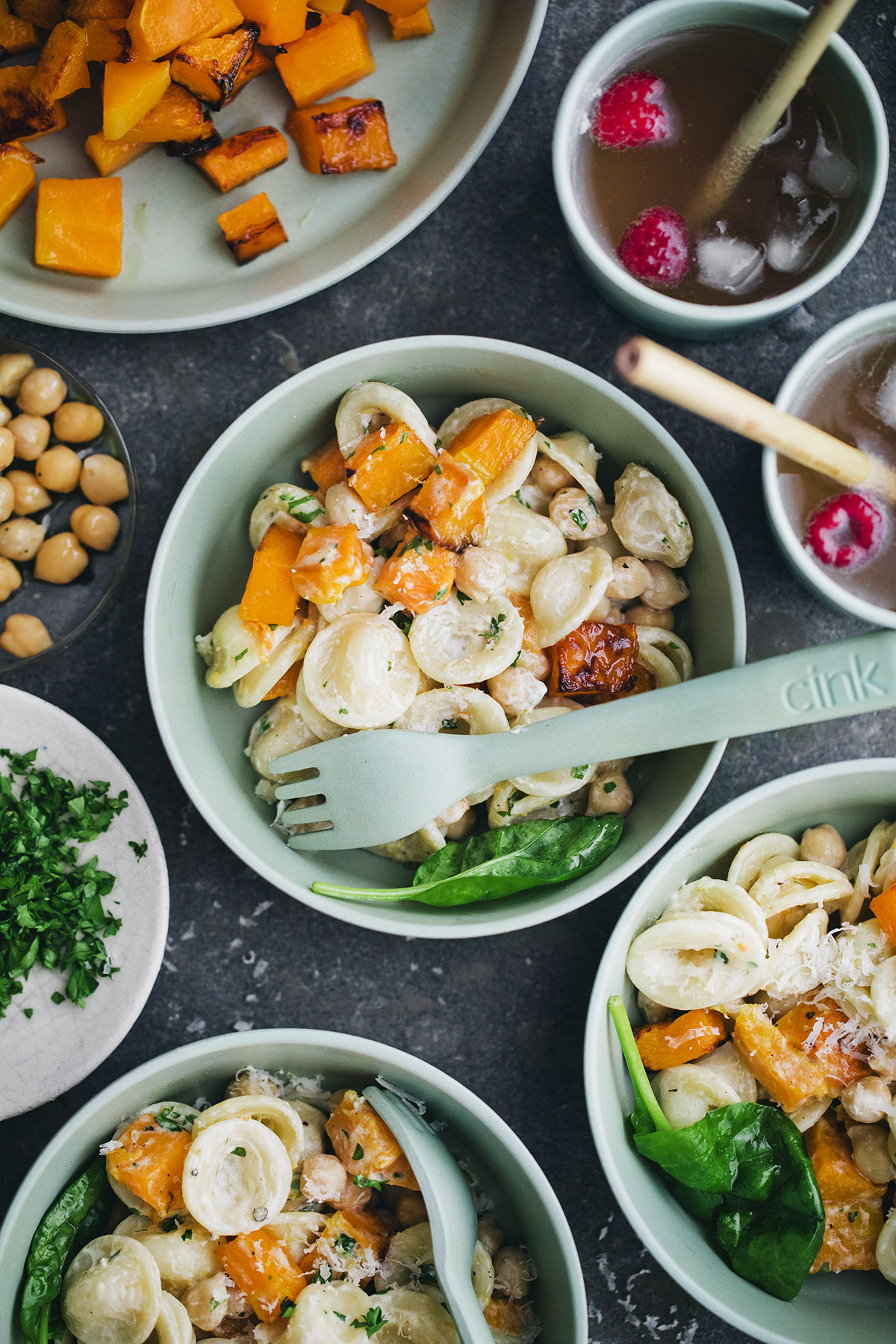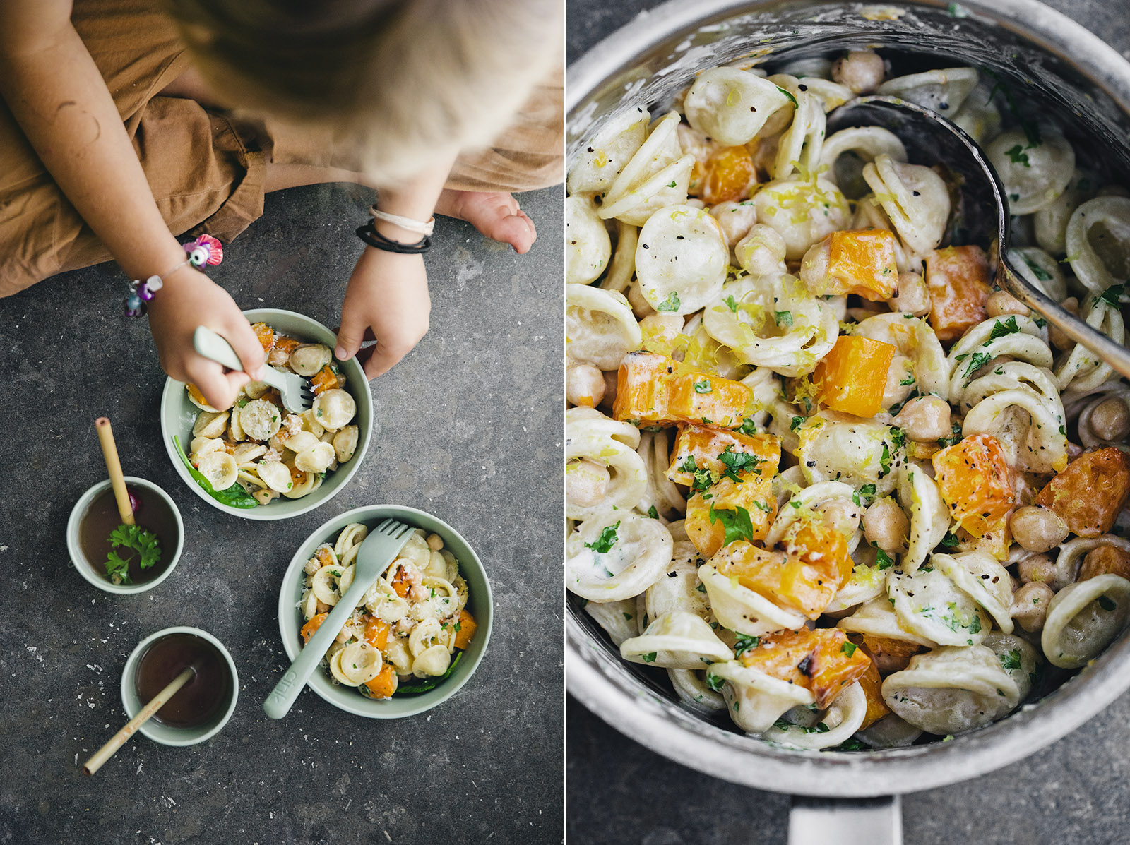 This is their "pasta with white sauce". It's perhaps not the most exciting pasta we have shared – just pasta that you stir through with some creme fraiche or yogurt + lemon + herbs and sweet roasted butternut pumpkin cubes and chickpeas to make it more nourishing – but we like how simple it is and we love that they like it. So we thought it was worth sharing. You can always add a drizzle of green sauce, harissa or more herbs to make it more exciting for adults.