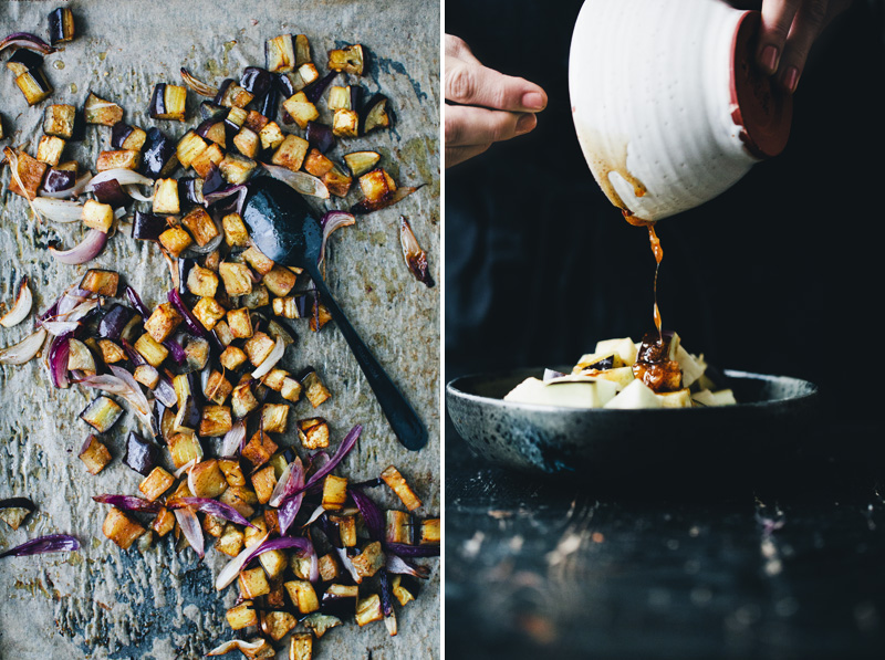 The result was beautiful, a true harvest salad. Maybe not as purple as I originally imagined it (basically because most vegetables loose their colour when they are cut/baked/cooked), but still with lovely deep hues and so many interesting flavours – a mix of herby, sweet and tangy.