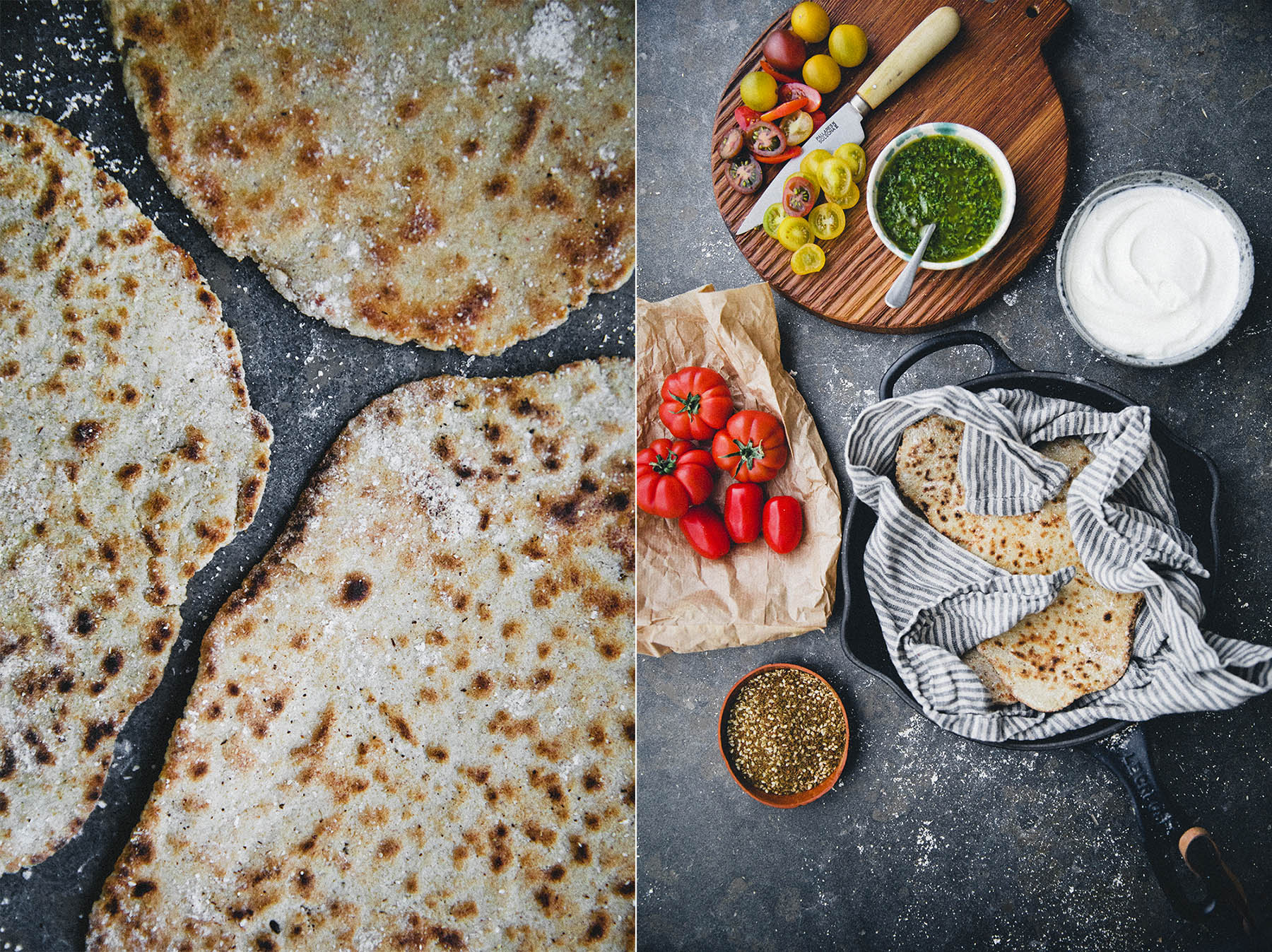 I've made flatbread with regular flour many times before, using cultured buttermilk or yogurt as the liquid. It is arguably the easiest bread you can make since you don't use an oven, only need two main ingredients (flour and liquid) and there is no proofing time. However, when I got home I realized that we didn't have any bread flour (and Luise asked me to do a gluten-free flatbread) so I gave it a try with oat flour (which we make by mixing rolled oats finely). And it worked really well! They hold together, can be flipped easily and the oats add a sweet nuttiness to them so they don't need any additional sugar. I used Turkish yogurt both in the dough and as topping. If you haven't tried Turkish yogurt on top of bread you need to give it a go – it adds that perfect combination fat + fresh. We sprinkled it with za'atar, covered it in thinly sliced tomatoes and made a riff on our Magic Green Sauce that we drizzled on top. The result will make you wonder why you are working so hard on keeping your sourdough starter alive. ;)