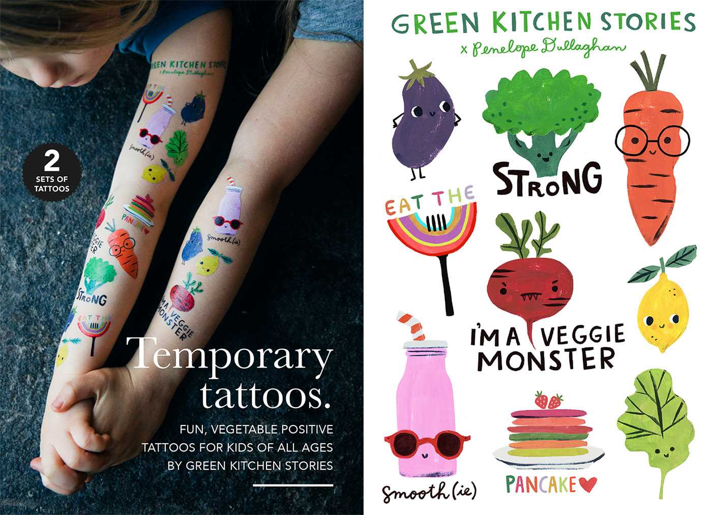 If you have followed us on social media this past year, you might have caught a glimpse of the vegetable tattoos that we created together with artist Penelope Dullaghan for the launch of our Little Green Kitchen book. We have often played around with various temporary tattoos in our family, and when we wrote this book we thought tats could be one more fun way to spread vegetable positivism. Maybe wearing a broccoli on your arm can be a good reminder for kids (and adults) to also eat them.