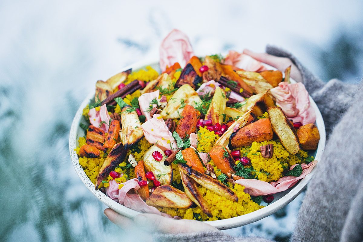 5. Serve in bowls topped with a drizzle of olive oil, fermented sauerkraut and Pistachio Dukkah Spice Blend.