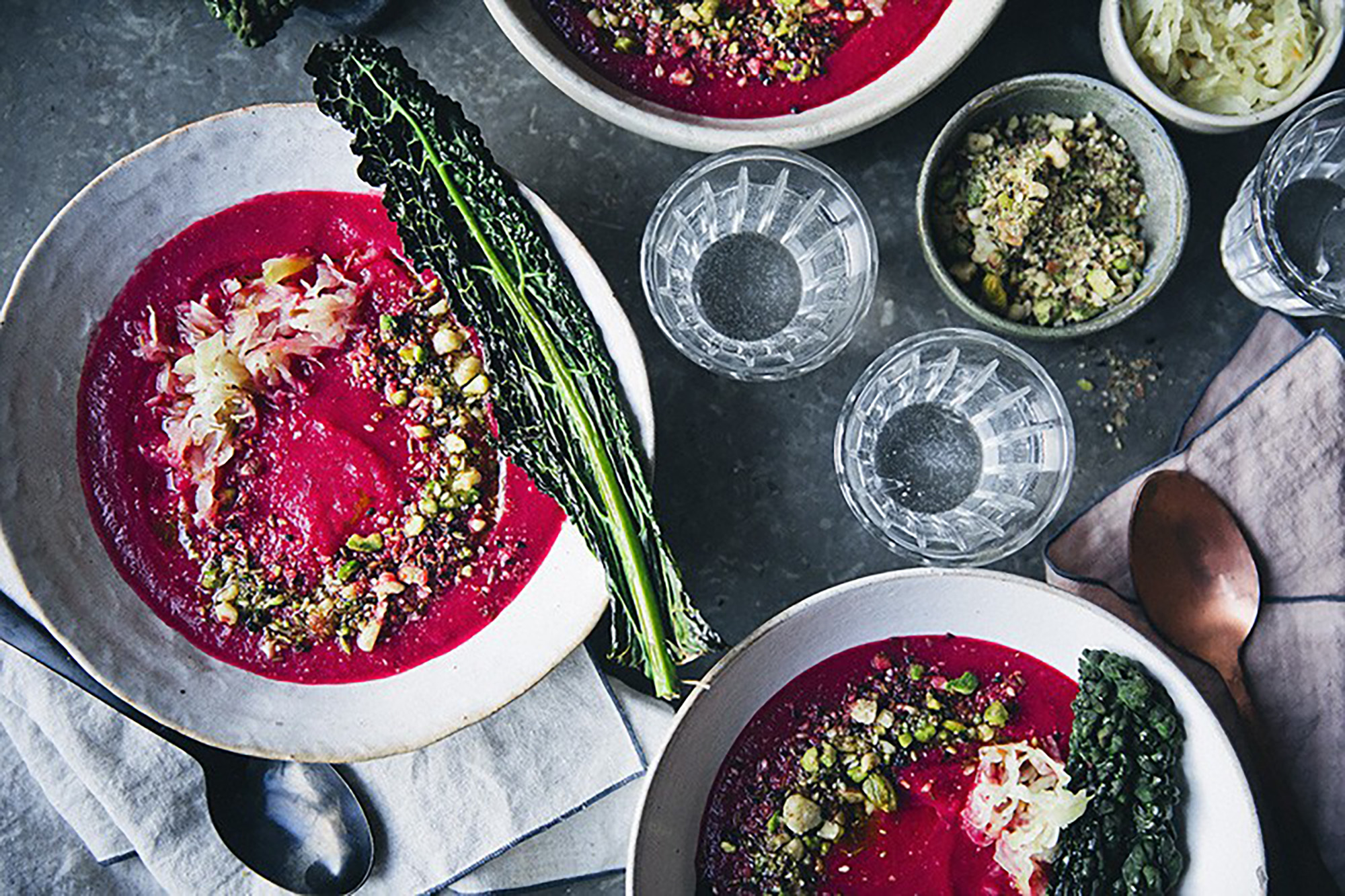 Hey there! We haven’t posted for a while because we wanted to get our new site ready (soon there!!!). But we got tired of waiting and felt like making a little food contribution on V-day so we cooked a red soup with cute and tasty toppings on. Unfortunately our kids rated this soup as “One of the worst soups they have ever eaten!” so that was kind of a bummer. But don’t listen to them. Your Valentine’s date hopefully has better taste than our kids. Because this is a good and simple little number with creamy cauliflower and potatoes, earthy beetroots and tasty spices. We serve it with sauerkraut and a generous drizzle of pistachio dukkah on top. So, happy Valentine’s Day. Cook this soup for someone you like. Make sure to top it with lots of dukkah. And don’t let your kids try it ;)