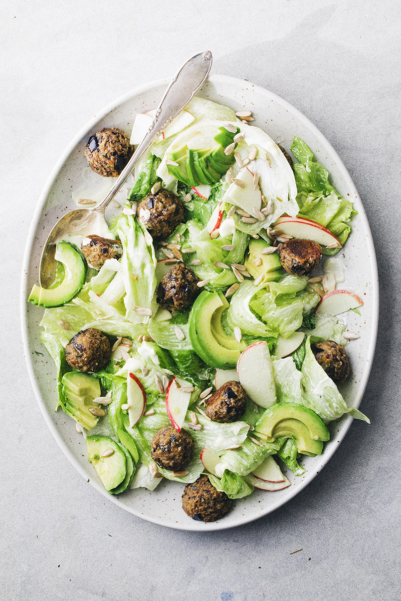Add all dressing ingredients to a tall glas or blender cup. Mix with a stick blender on high speed for about 15 seconds or until you have a creamy white dressing. Taste and adjust the flavours to your preference. Add more oil and blend again if you like it thicker. Tear the lettuce into bite size pieces and place in a mixing bowl. Add 2 tbsp vegan mayo dressing and toss to cover. Then transfer to a serving platter and arrange avocado slices, apple slices and aubergine polpette and last, scatter over toasted sunflower seeds.