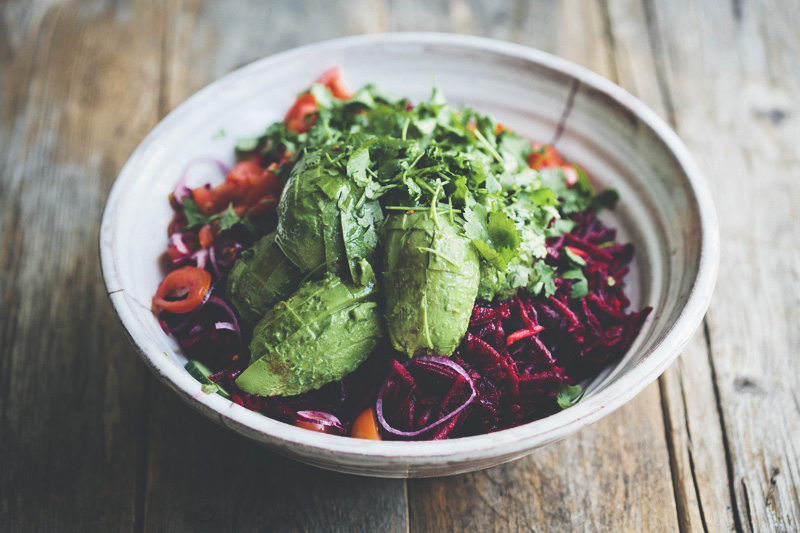 Rinse the lettuce leaves and coarsely chop them. Place in a large mixing bowl. Peel beets and carrots and grate by hand or using the grating attachment on a food processor. Slice the onion and tomatoes very thinly. Chop the avocados and cilantro and place all prepared ingredients in the mixing bowl. Add olive oil, lime juice, salt and pepper and toss well, using your hands, so everything is coated in oil and lime and has a nice purple color.
