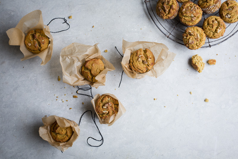 Lower the oven to 350°F / 180°C. Sift togehter all dry ingredients in a mixing bowl. Beat the eggs, in another mixing bowl, for about a minute. Then add the rest of the wet ingredients while constantly stirring. Add the dry mixture to the wet mixture, using a spatula. Add pecan nuts and gently fold until combined combined. Line a muffin pan with paper liners. Divide the batter into them, it should be about 2 large spoonfuls in each. Smoothen out the batter with the backside of a wet spoon. Sprinkle with few pecan nuts. Bake for about 22-25 minutes, or until golden on the outside and baked through.