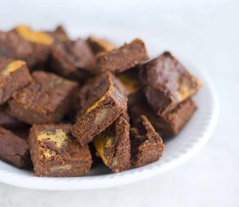 Pour into the baking pan. Drip the remaining egg mixture on top of the chocolate mixture and use a toothpick or a knife to create a marble effect. Bake for 30-40 minutes. They might still feel a little bit loose in the middle when you take them out, but the trick here is to wait until they cool off completely (I know, it’s hard, but it’s totally worth the wait). Enjoy!