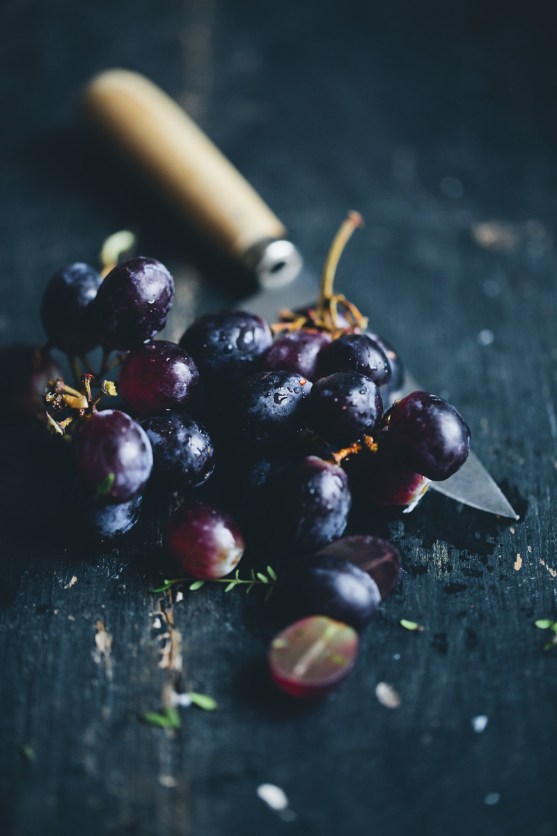 Preheat the oven to 200°C / 400°F. Prepare the vegetables, peel parsnip or parsley root, garlic and onion. Cut into large bite-size pieces. Place in a bowl and lightly drizzle with olive oil, toss to cover. Cover a baking sheet with baking paper and arrange the vegetables on it. Place in the oven and bake for 15-20 minutes, until tender and lightly browned. Meanwhile blanch the almonds and heat the water in a water boiler. When the vegetables are done, remove from the oven and place in a heat proof blender. Add blanched almonds, hot water, apple cider vinegar, thyme, salt and pepper and blend until completely smooth. Taste and adjust the flavors to your preference. Serve immediately in serving bowls, garnish with a drizzle of olive, thyme and grapes.