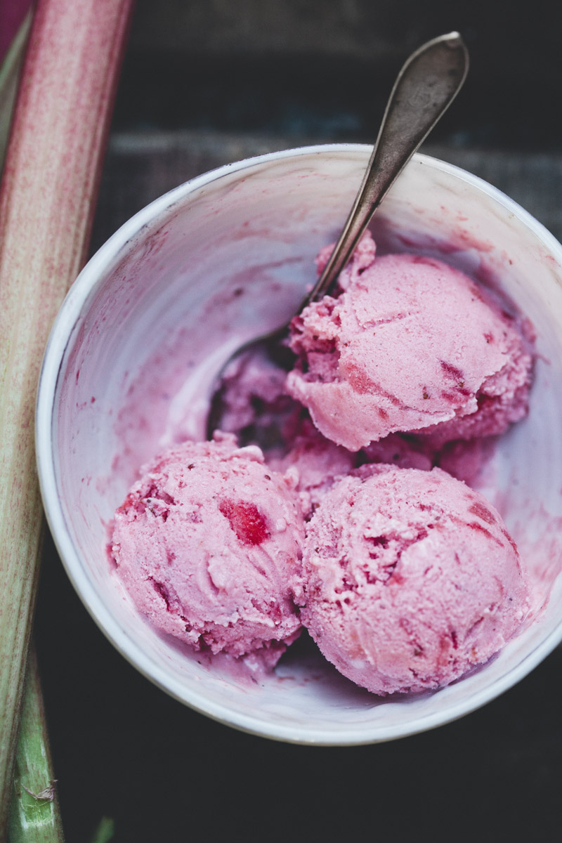 I would love to say that ever since then, ice cream has had a special place in our hearts. But actually, I think my love affair with ice cream stopped when my love affair with Luise begun. Don’t get me wrong, we are still quite the ice cream eaters. But it’s not extreme anymore. We stick to the good stuff every once in a while. And when we do ice cream at home, we almost always make it yogurt-based. We have a really delicious coconut frozen yogurt recipe in our dessert app. With Summer around the corner, rhubarb and strawberries are starting to pop up everywhere. So we felt almost obliged to make a FroYo out of them.