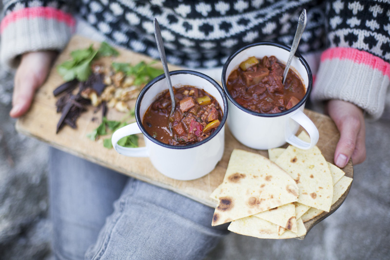 Friday night. Elsa is sleeping. Finally time to write that post we prepared earlier this week. I’ve been looking forward to share this recipe, as I am pretty certain that many of you will like it. This bean chili (or chili sin carne, as David calls it) is not only warm, comforting and spicy. It also has the most wonderful flavor from dark chocolate, coffee, red wine and crunchy walnuts. I seriously can’t think of a more perfect recipe to embrace autumn with.
