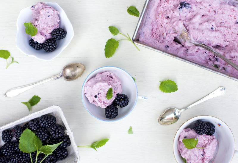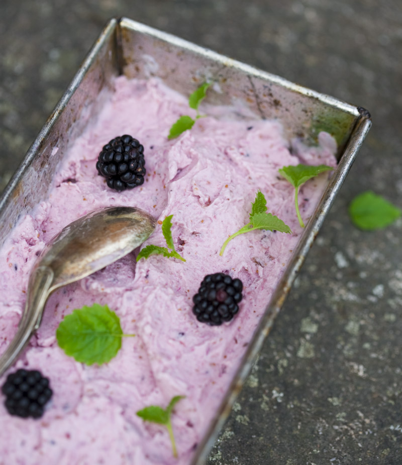 Start by removing the ends from the figs. Cut each fig into 8 pieces. Put them in a saucepan, add water, lemon zest, coconut flakes and ginger. Cook over medium heat, stirring occasionally, for about 10 minutes until the figs are tender. Add honey and around 10 blackberries. Continue to cook for about 15-20 minutes (you might want to lower the heat a bit) until it reaches a jam-like consistency. When it’s done, remove from the heat and let cool to room temperature. Use an immersion blender or food processor to quickly mix it together with the coconut milk and lemon juice. Don’t mix too hard, it’s nice with some fruit pieces here and there. Chill well in the fridge (otherwise you will have yourself a fig milkshake, we have tried that…) before you put the mixture in an ice cream maker for about 25 minutes or however long your brand of ice cream machine suggests. Serve with fresh blackberries and a few leaves of fresh lemon balm.