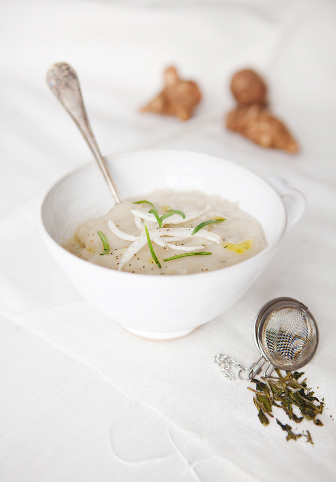 Start by peeling the sunroots (or bribe someone to peal them for you). As soon as they are peeled, put them in a large bowl with cold water (and a squeeze of lemon in it), this prevents them to turn dark. Pick up the peeled sunroots from the water and chop them into 1-inch pieces. Put a big pot on medium heat on the stove. Saute the leek, garlic and the sunroots for a couple of minutes. Add the lemon juice, the chopped rosemary, salt and pepper and about two thirds of the green tea. As soon as it starts boiling, turn down the heat to low, and let it simmer for about 30 minutes. Take the soup off the stove and blend it. If the soup feels too thick, add the rest of the green tea and let it simmer for two minutes more. Taste it, add more spices and lemon juice if needed. Serve with a dash of olive oil, fresh rosemary and some thin slices of fennel. Enjoy!