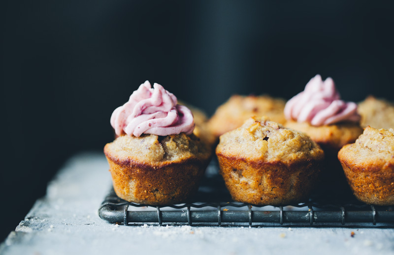 Preheat the oven to 200°C / 400°F. Grease a muffin tin (mini or regular size) or line it with paper or silicon cup liners. Place all of the dry ingredients in a bowl, stir together and set aside. Add the dates to a food processor and blend on high speed. When smooth, add the banana and coconut oil and blend again. Finally add yogurt and eggs and blend until smooth and entirely mixed. Pour the wet ingredients into the bowl with dry ingredients and stir together. Drop the batter into the muffin tins, place 1-2 raspberries in the centre of each muffin and cover it with batter. Bake for 10 minutes (17-20 minutes if you are using normal size muffins) or until golden and just set. Prepare the frosting while the muffins are in the oven. Leave the muffins to cool before piping the frosting on top. Serve immediately or store in the fridge.