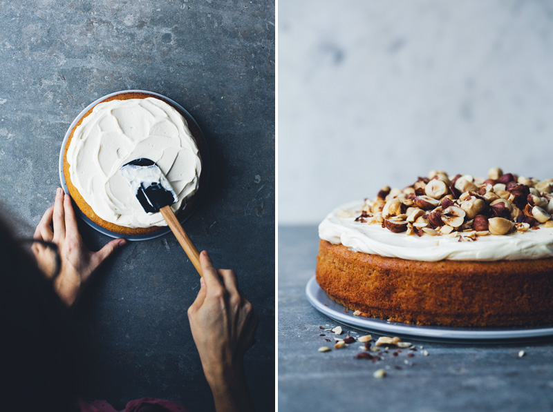 Since Christmas is coming up, we spiced the cake with warm tones like ginger, cinnamon and clove that go perfectly with the flavour from the roots. It might not be the most traditional Christmas cake on the table but I am quite certain that Santa won’t mind. It is topped with orange flavoured quark cheese or cream cheese, orange zest and roasted hazelnuts. If you can’t find quark, you can make a sweet quick version of labneh instead by mixing 2 cups greek yogurt with 1-2 tbsp maple syrup and some orange juice and strain it in cheese cloth for a few hours until it is firm enough to spread on a cake.