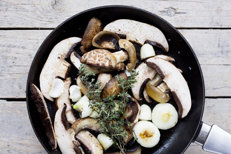 Searing the mushrooms and pearl onion: Heat olive oil in a pan. Lower the heat and sear the portobello, champignon mushrooms and pearl onions, stirring occasionally, until tender and golden in color. Season to taste. Set aside.